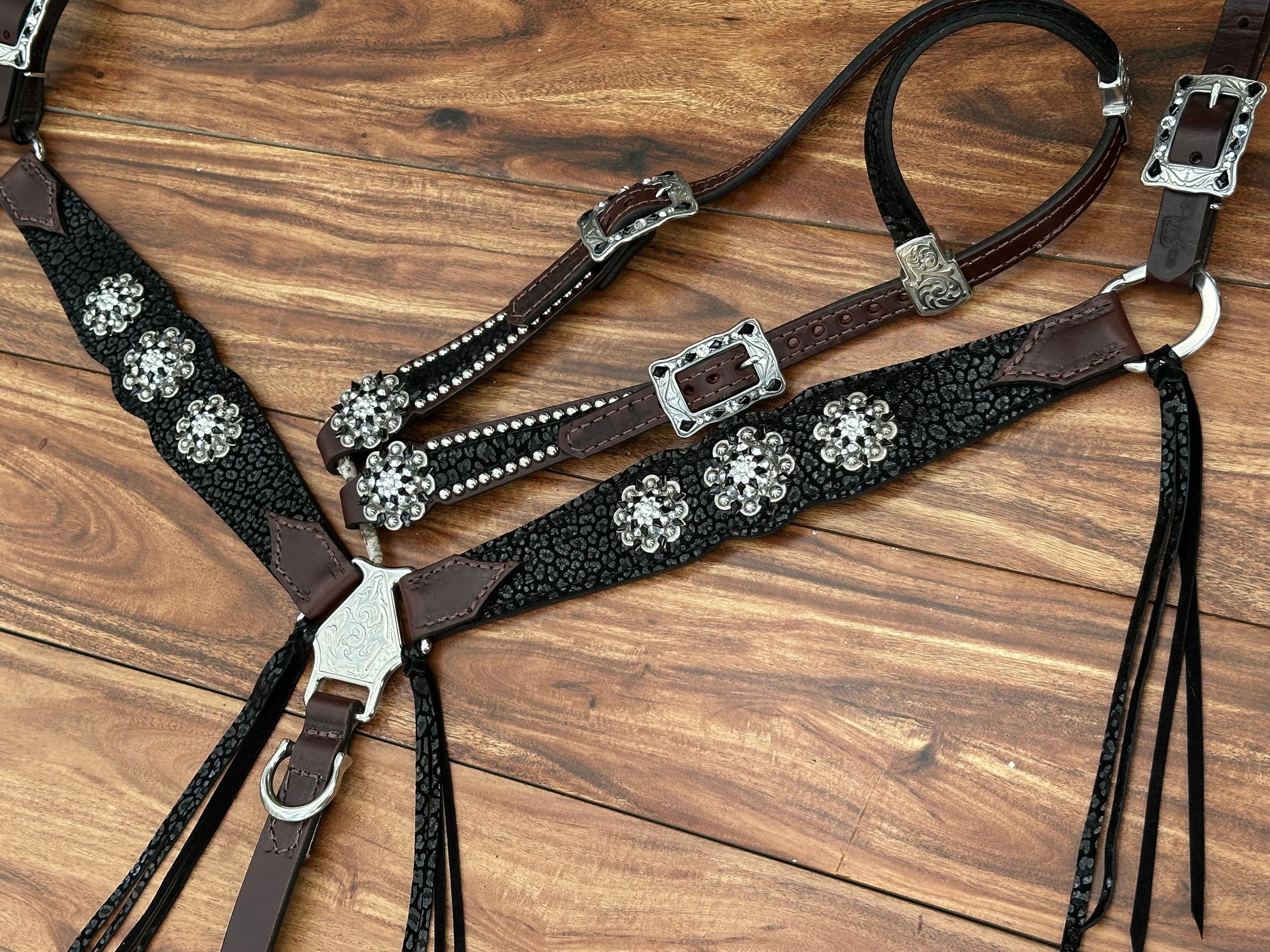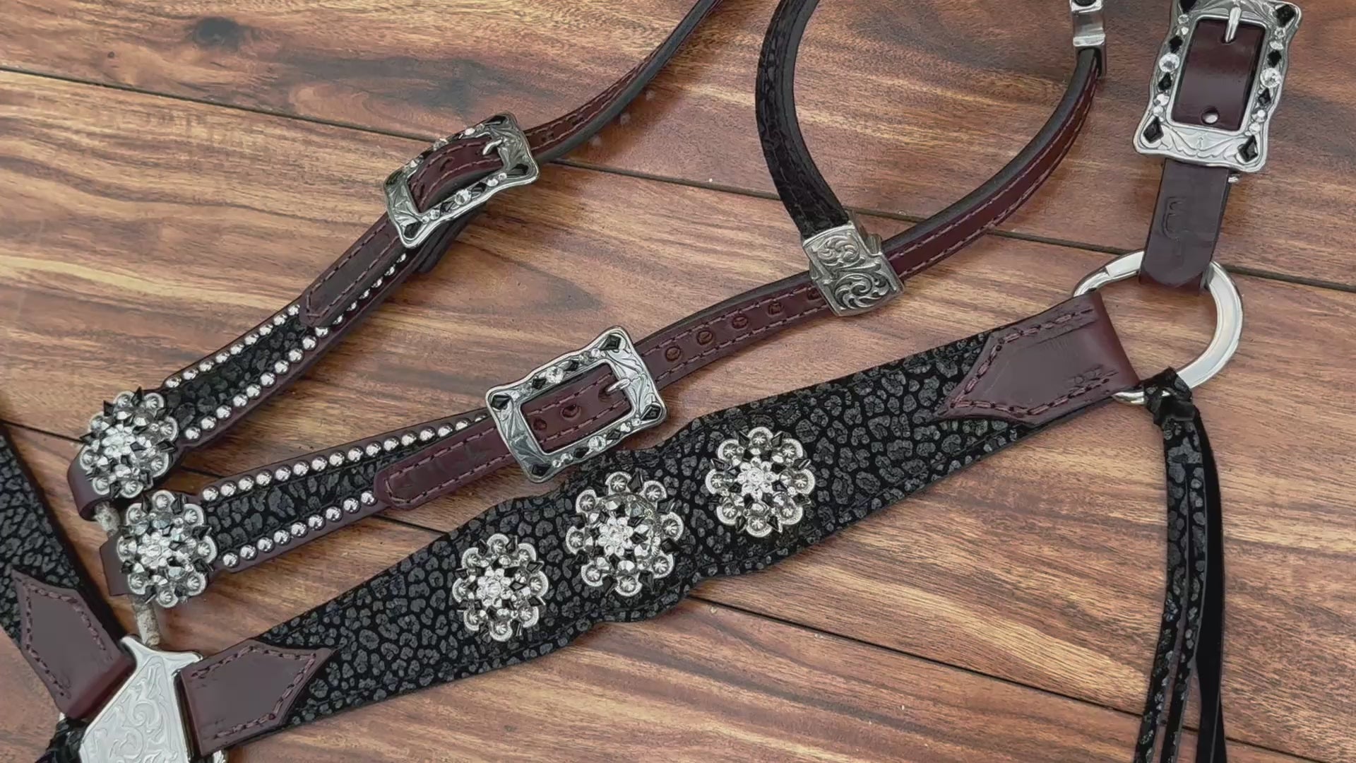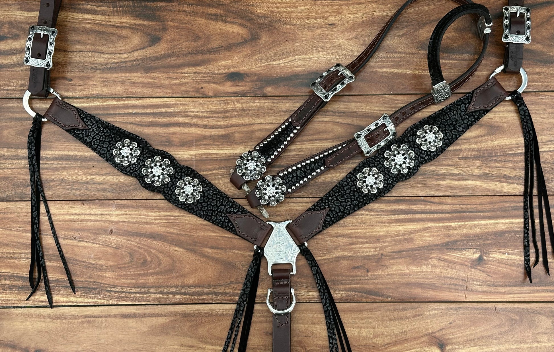 Black cheetah on Dark Oil Leather. Fringe on hardware, with stainless steel accents.