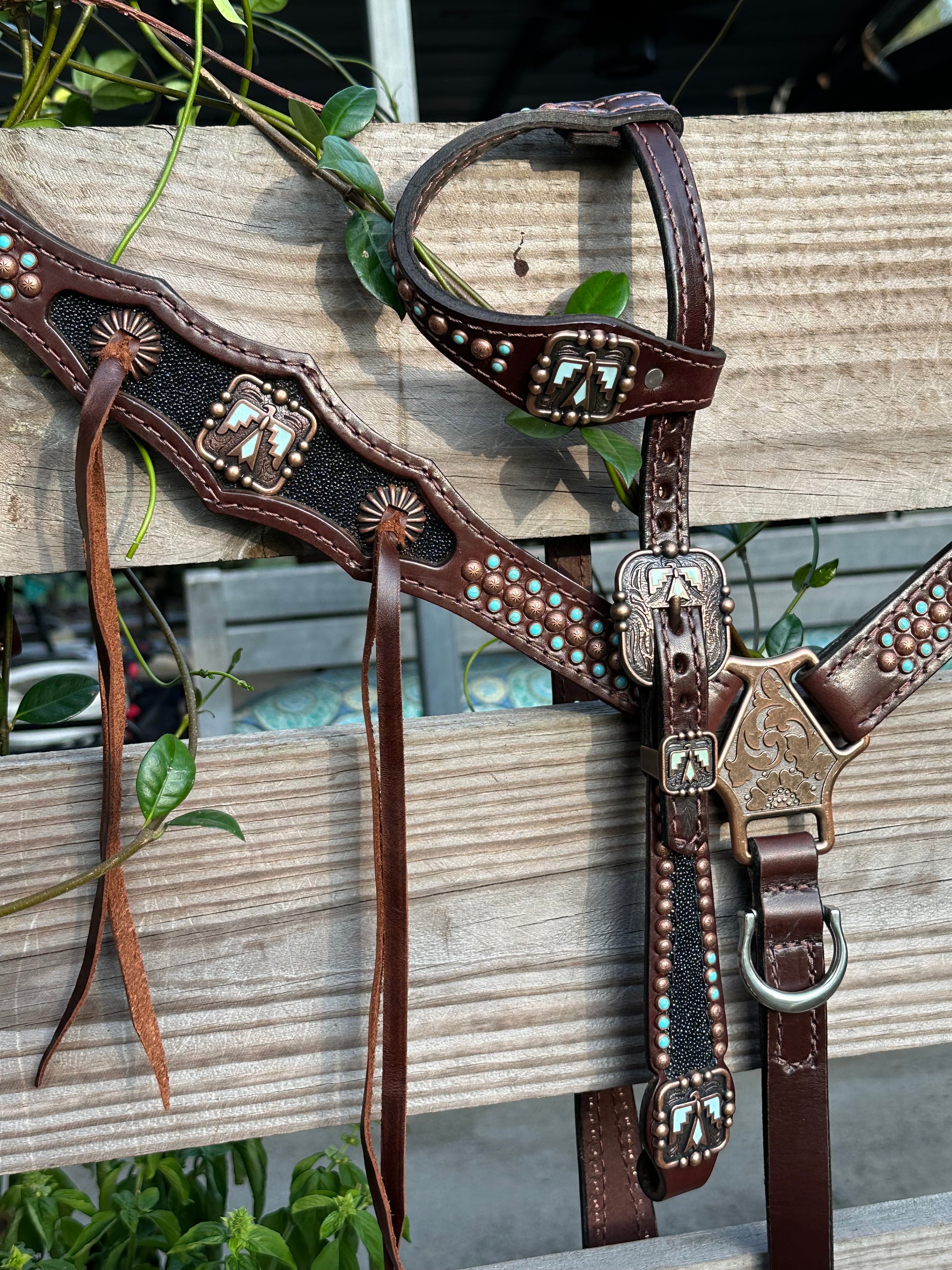 Beautiful authentic black stingray with turquoise thunderbird buckles and conchos. .