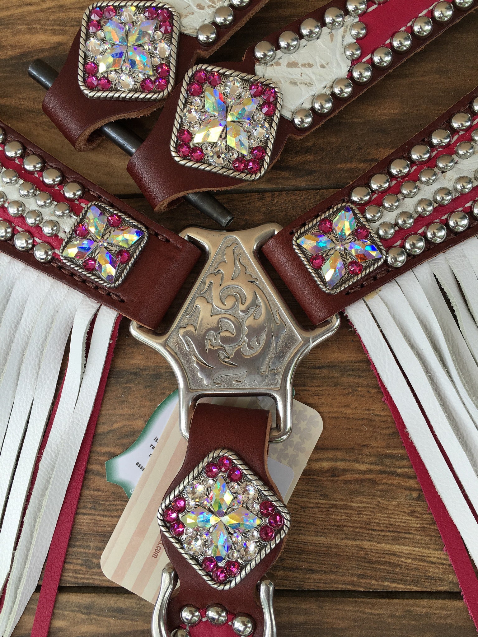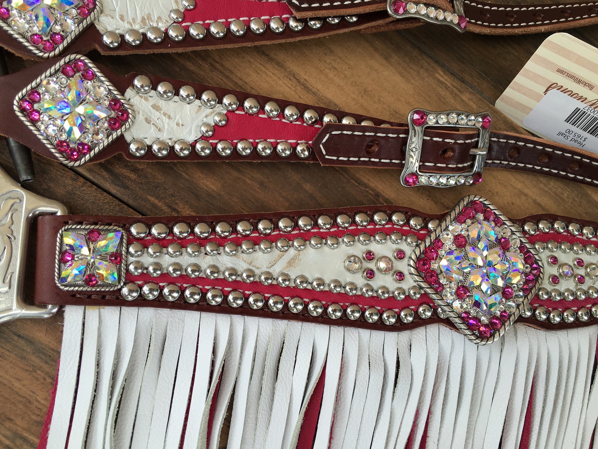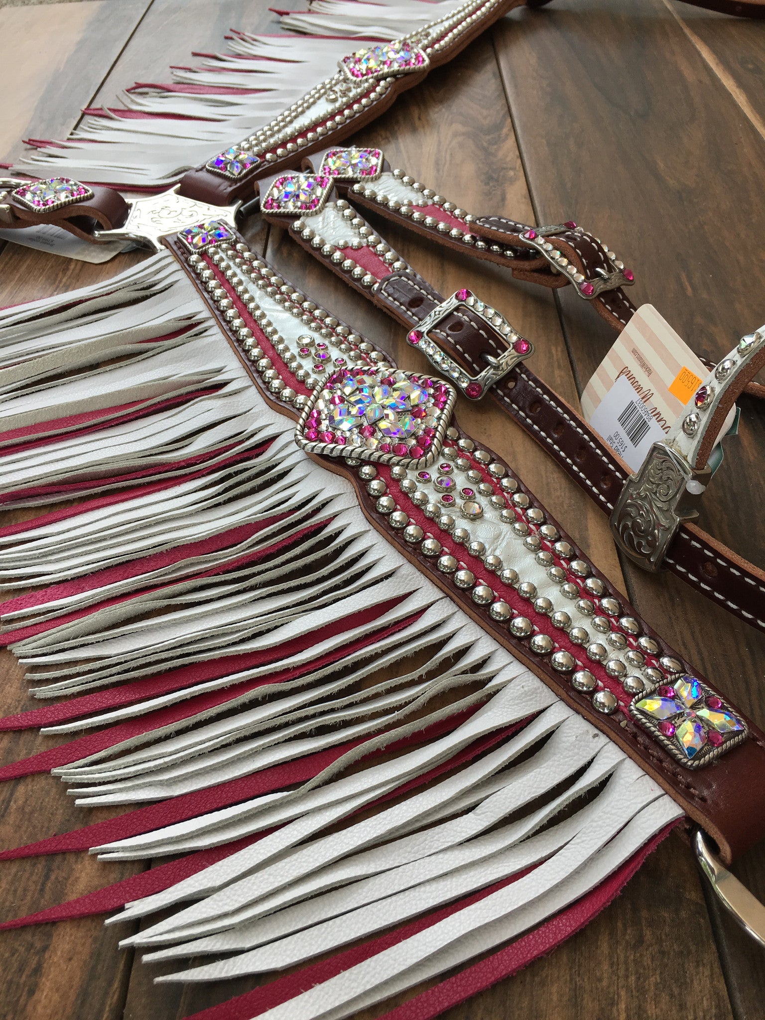 Beautiful pink and white with big flashy conchos, plenty of chrome and bright white and pink fringe!