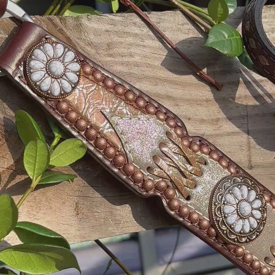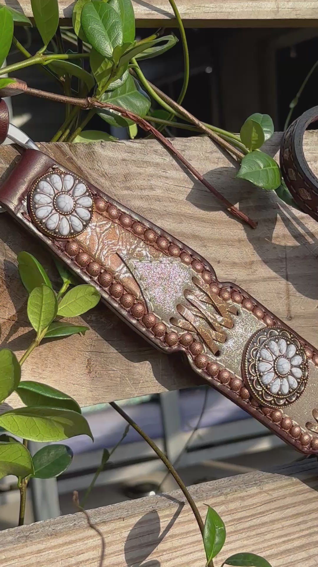 Silver dazzle over Brown with cross stitch and beautiful copper conchos.