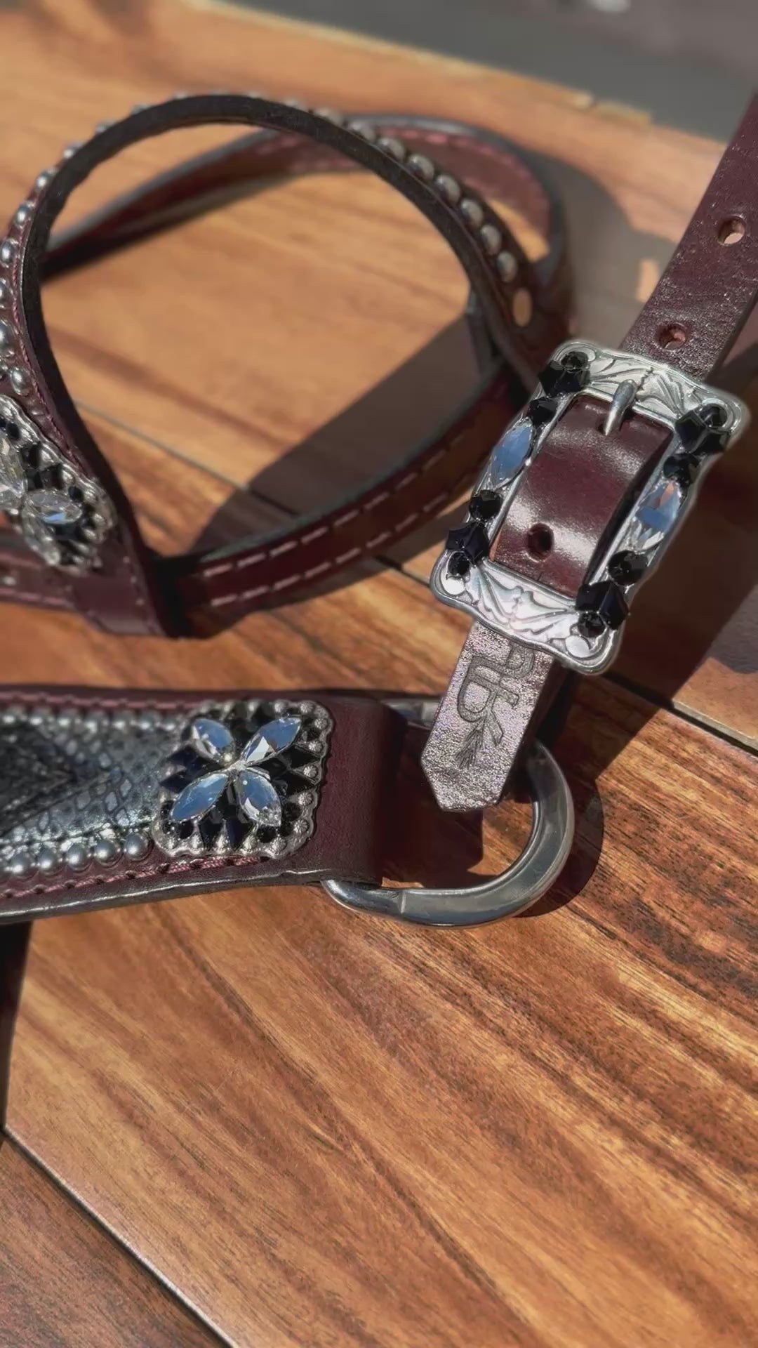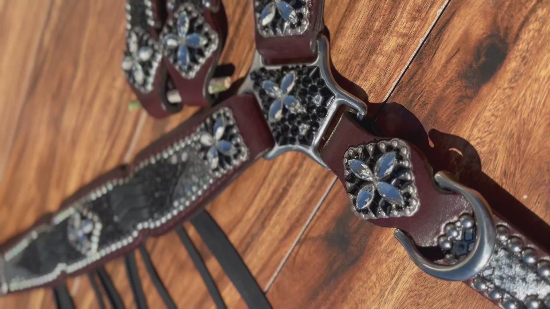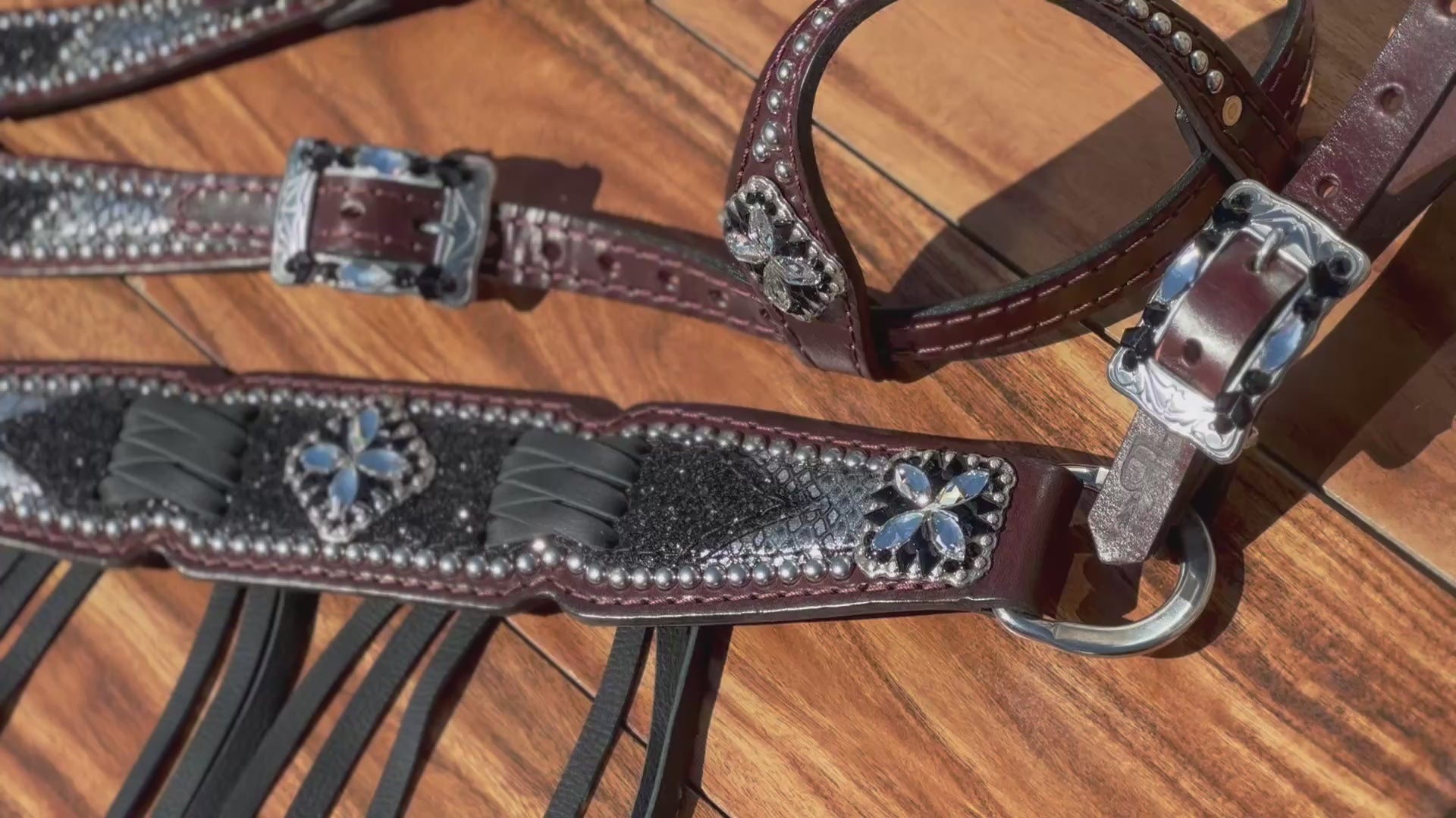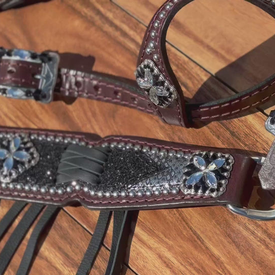 Black chunky glitter over silver mystic with black cross stitch and beautiful crystal covered conchos.
