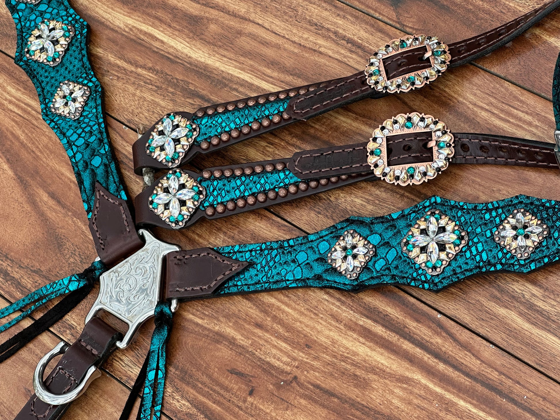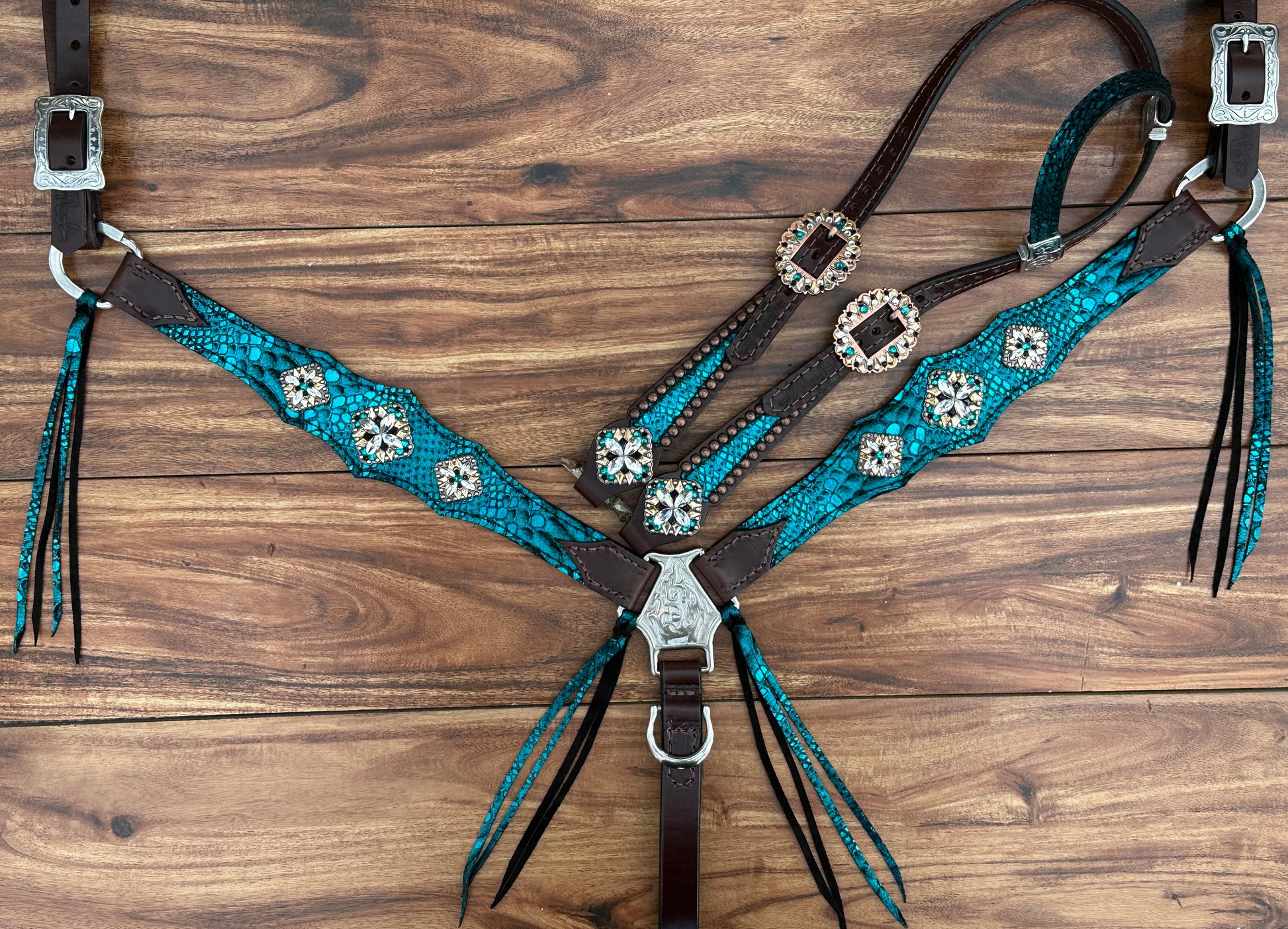 Turquoise Mystic on Dark Oil Leather. Fringe on hardware, with stainless steel accents.