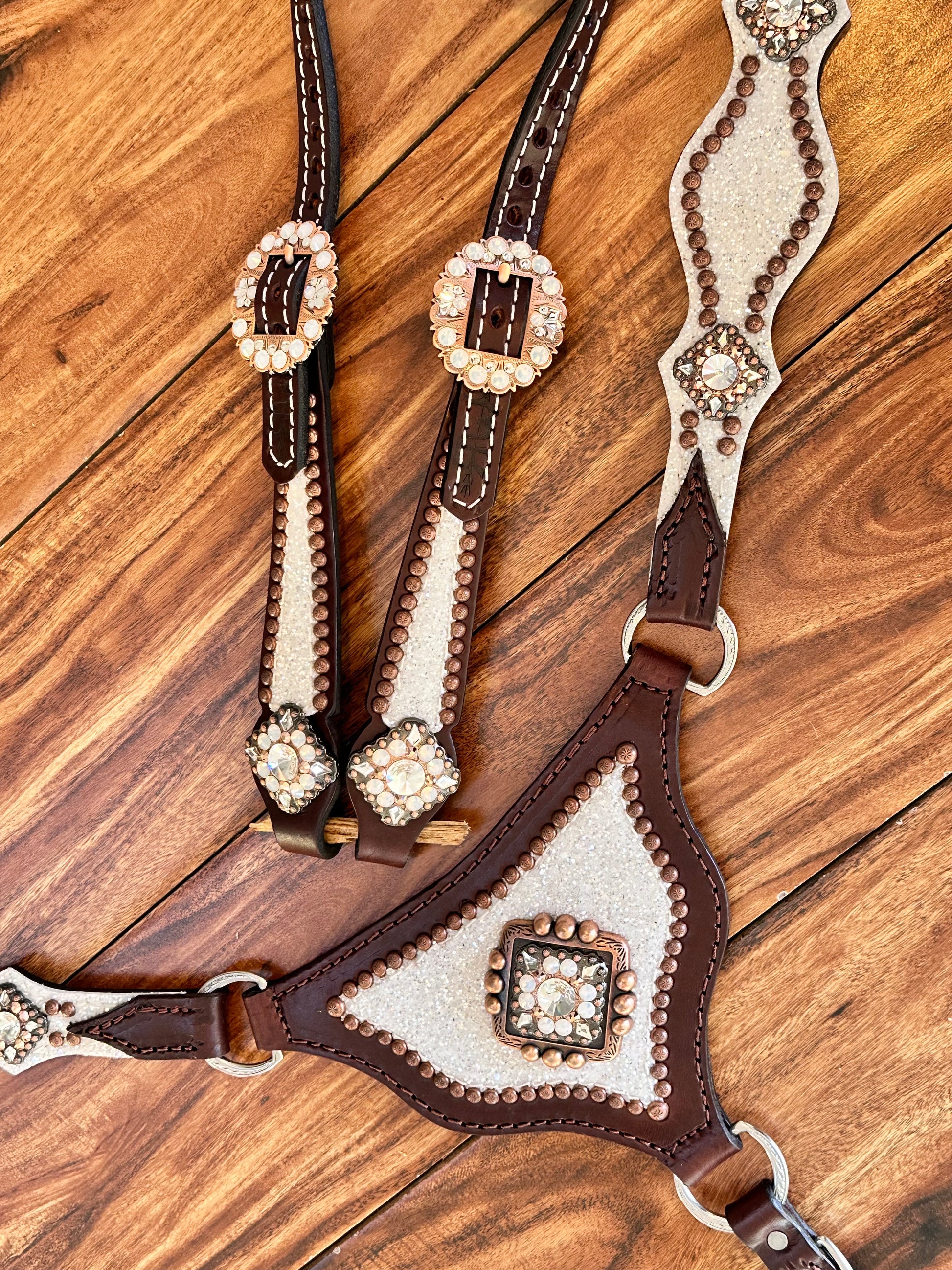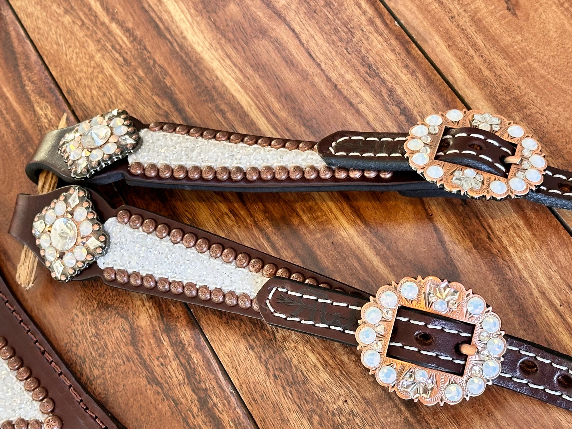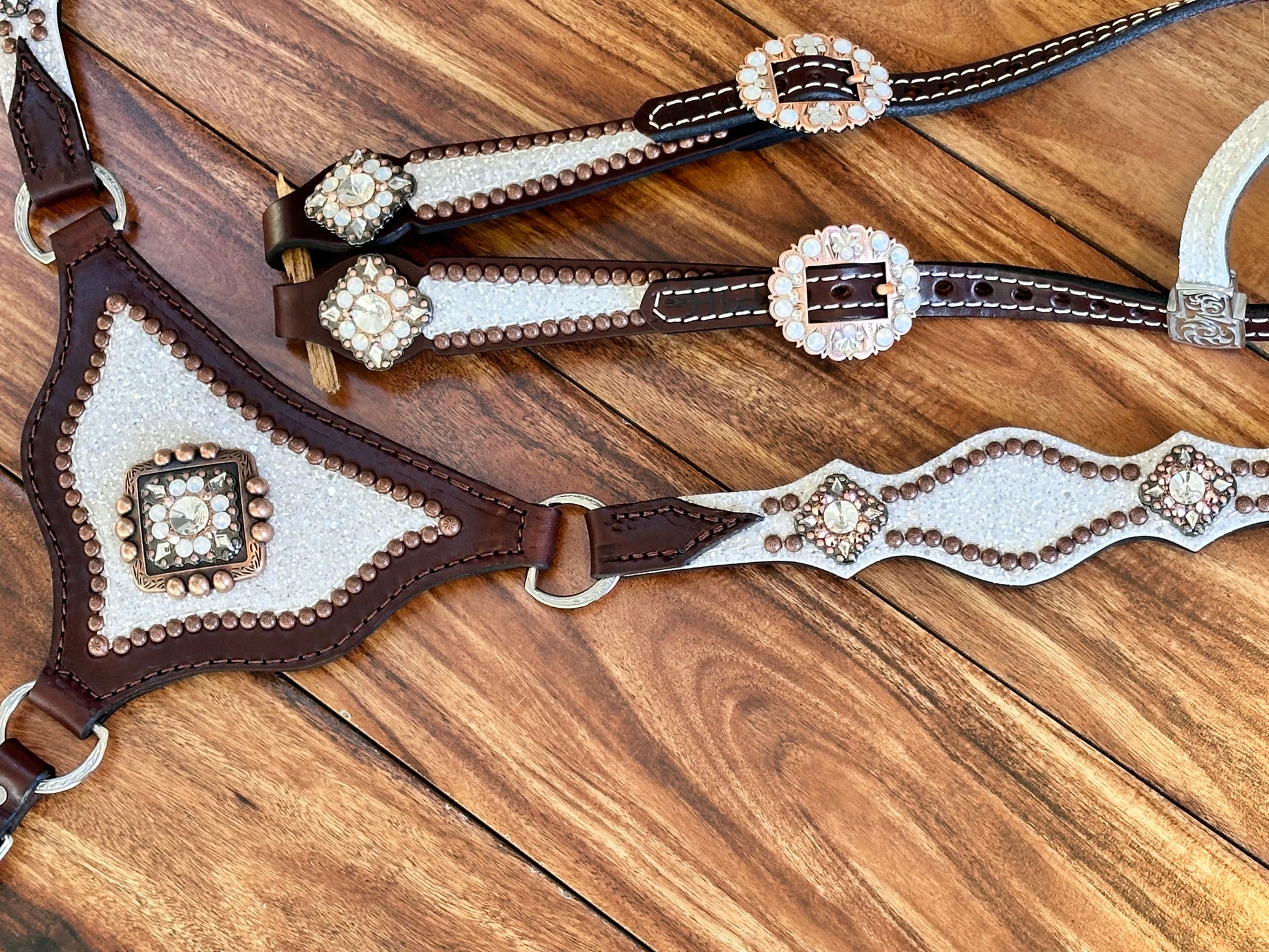 This beautiful white chunky glitter is available in a one ear Headstall, or breast collar. The conchos are loaded with Rose Gold, white opal and, crystal. Elevate your riding experience to new heights of elegance and style.