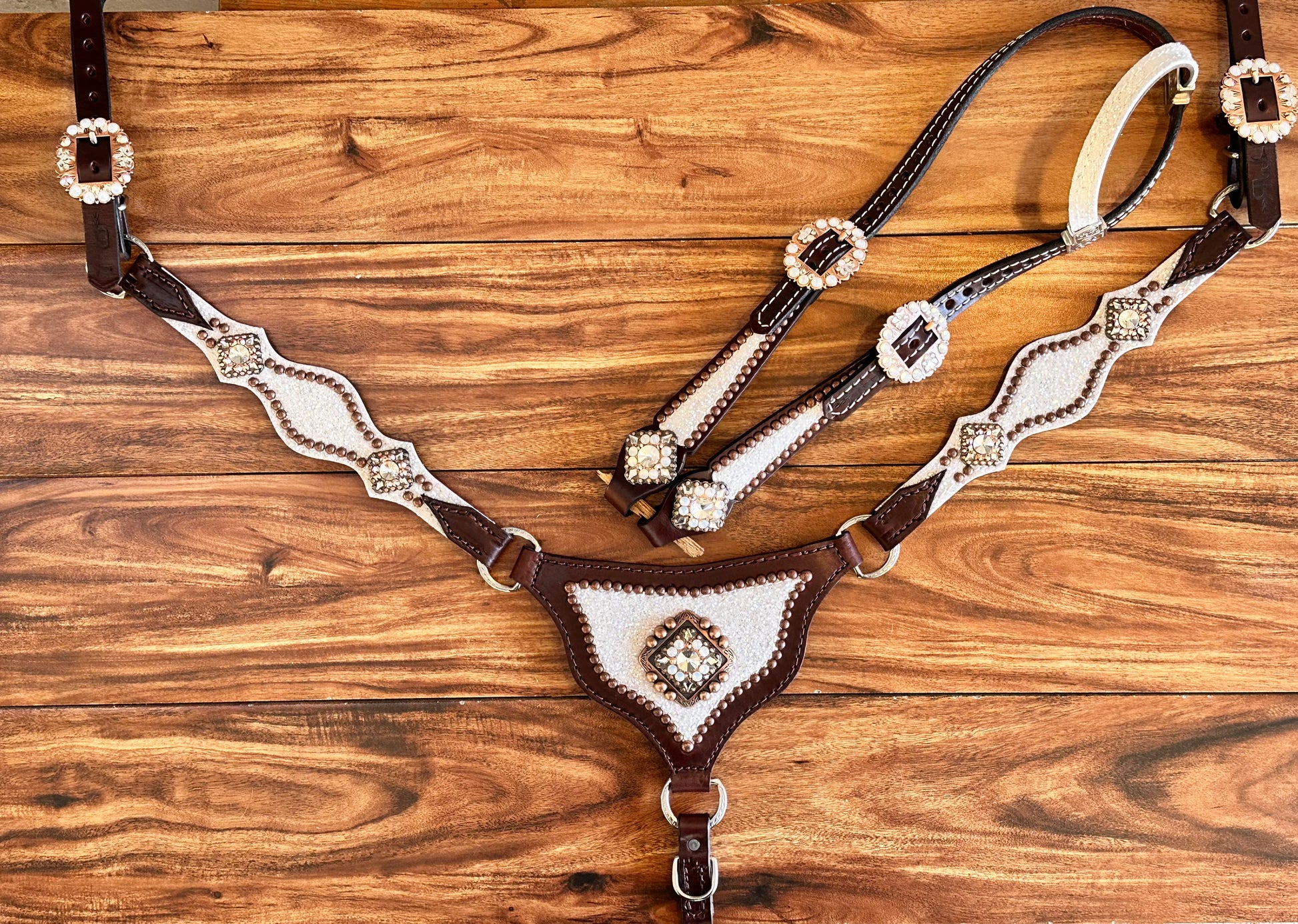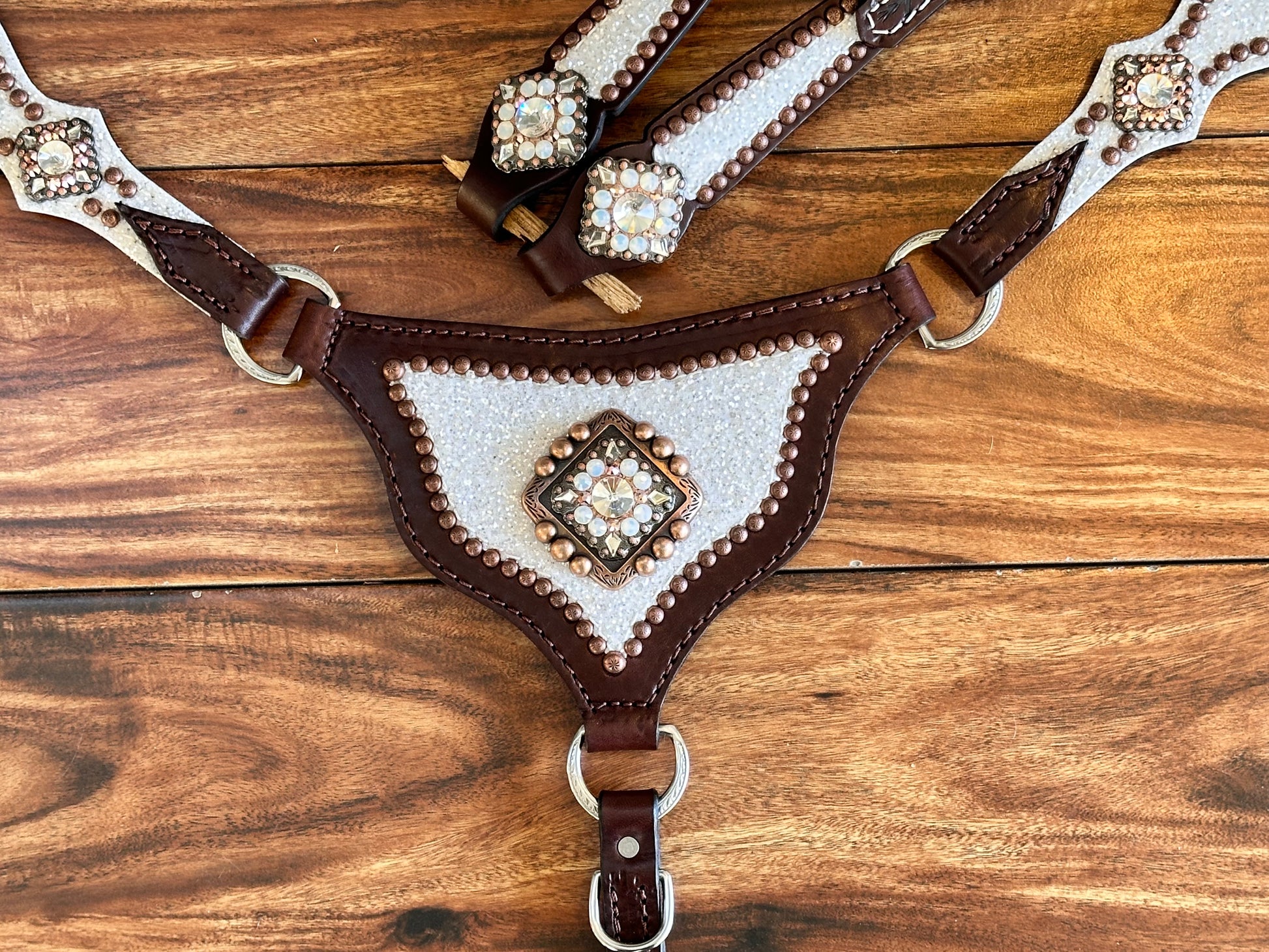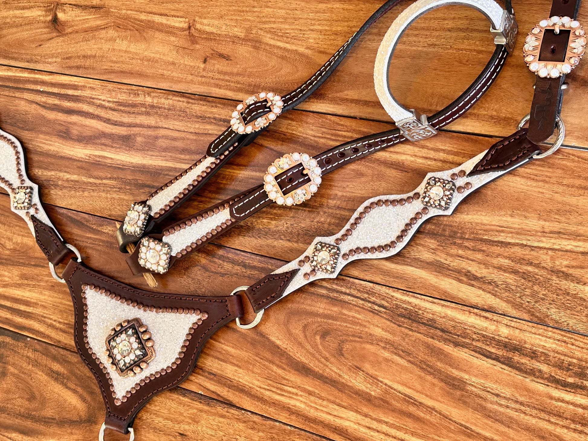 This beautiful white chunky glitter is available in a one ear Headstall, or breast collar. The conchos are loaded with Rose Gold, white opal and, crystal. Elevate your riding experience to new heights of elegance and style.